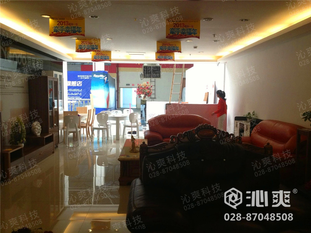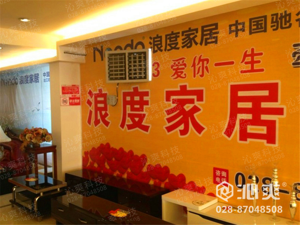 成都浪度家居有限公司——专卖店展厅通风降温工程实例,安装沁爽冷风机降温换气机组46台,施工时间:2014年6月至2014年7月